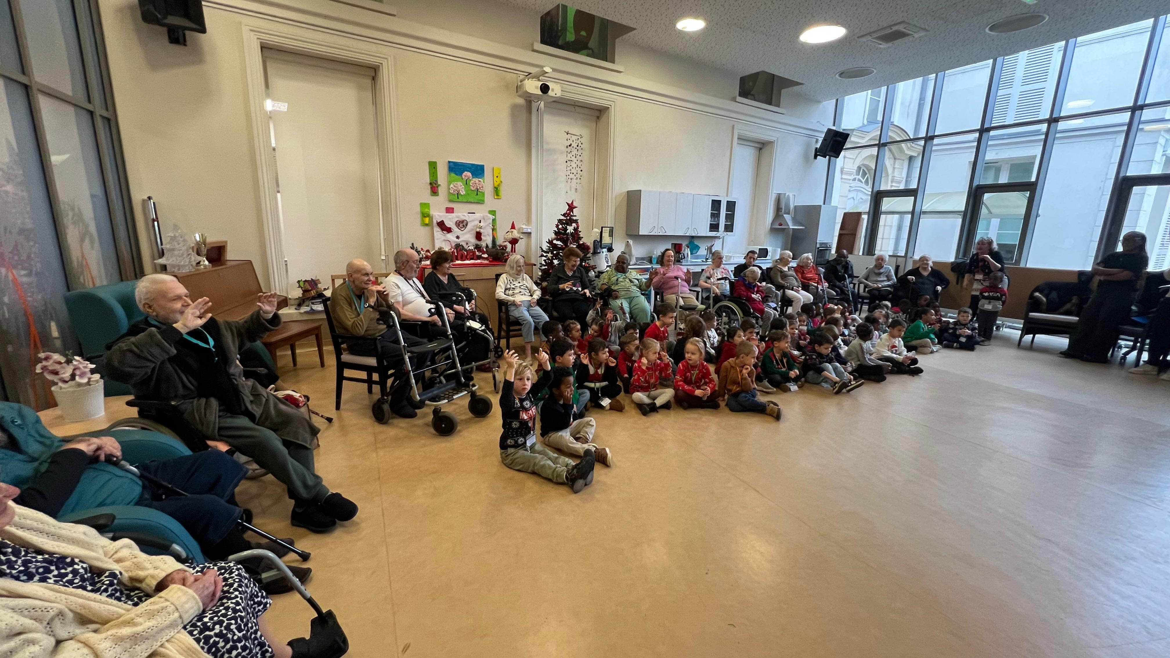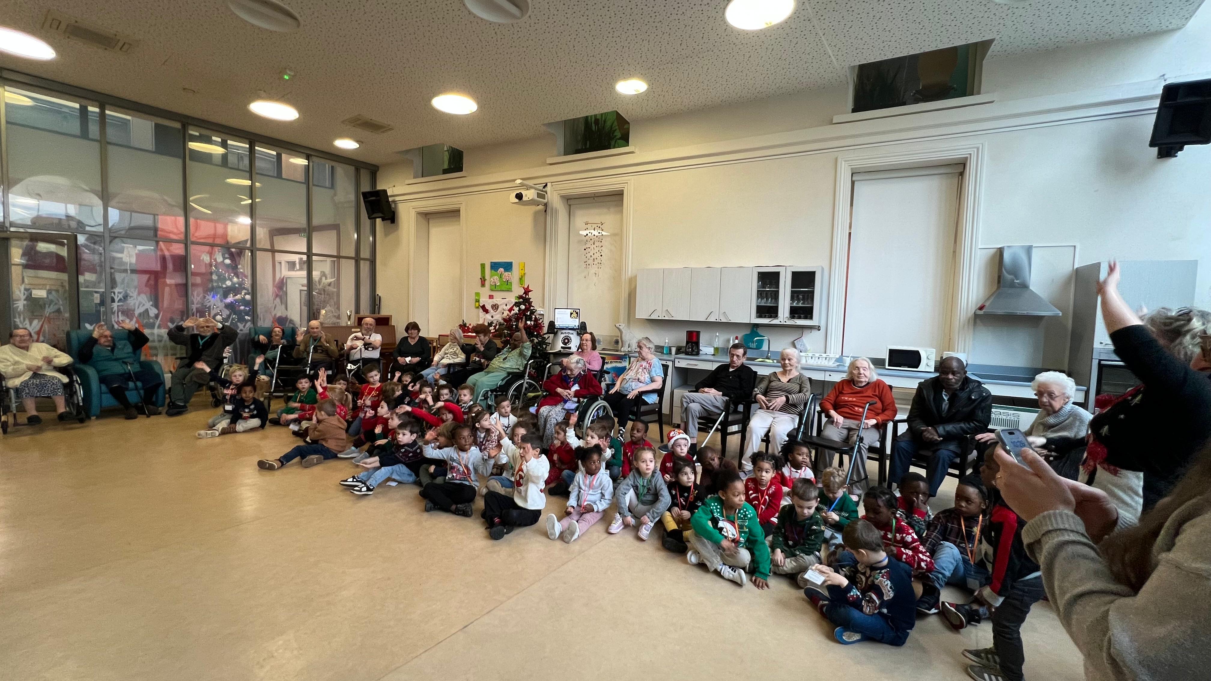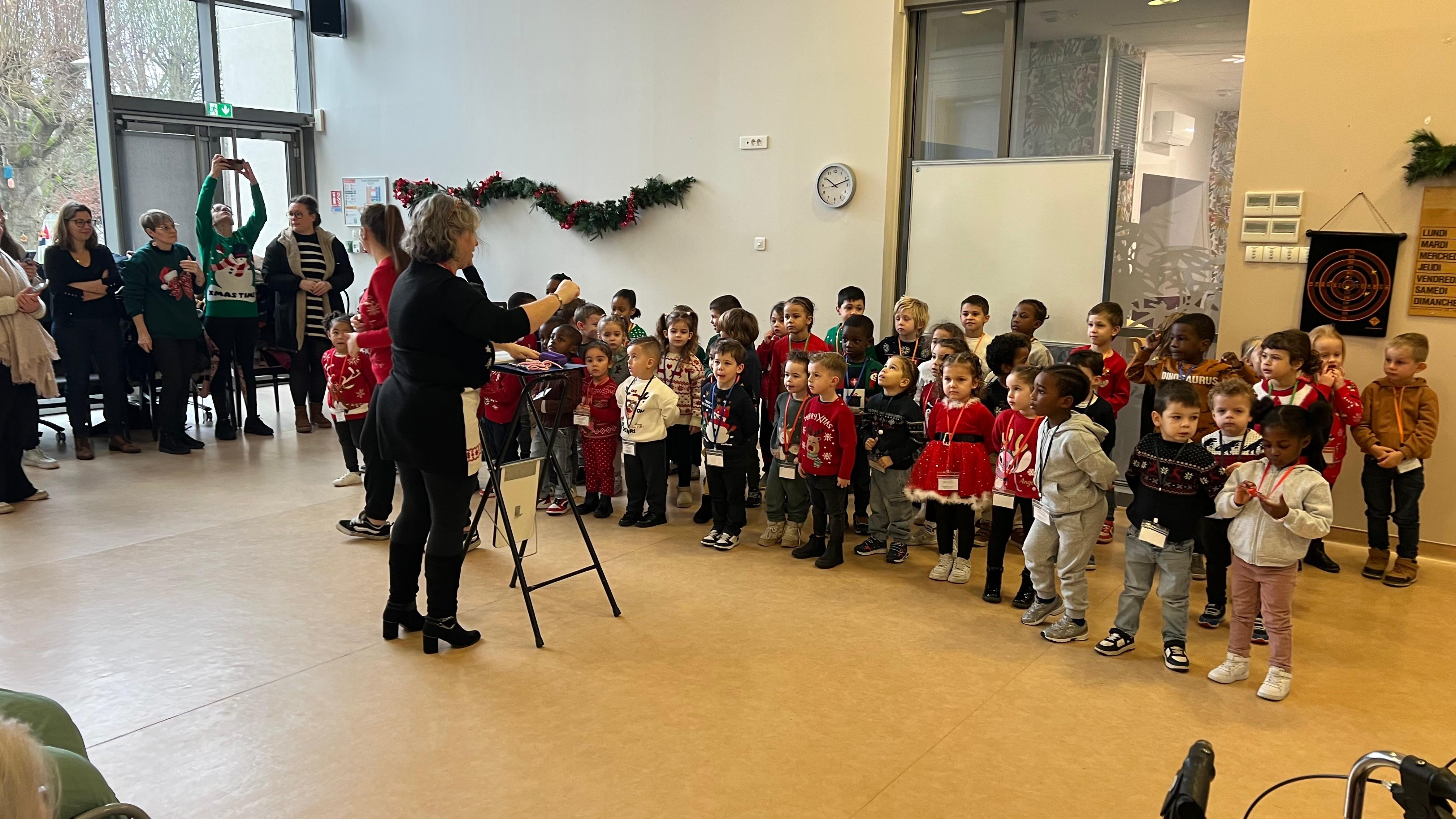 Nous avons eu la chance d’accueillir les élèves de l’école maternelle de la ville pour un petit concert. Ils étaient tous revêtus de leurs plus beaux vêtements de Noël. Ils ont terminer par une danse que nous avons repris tous ensemble.