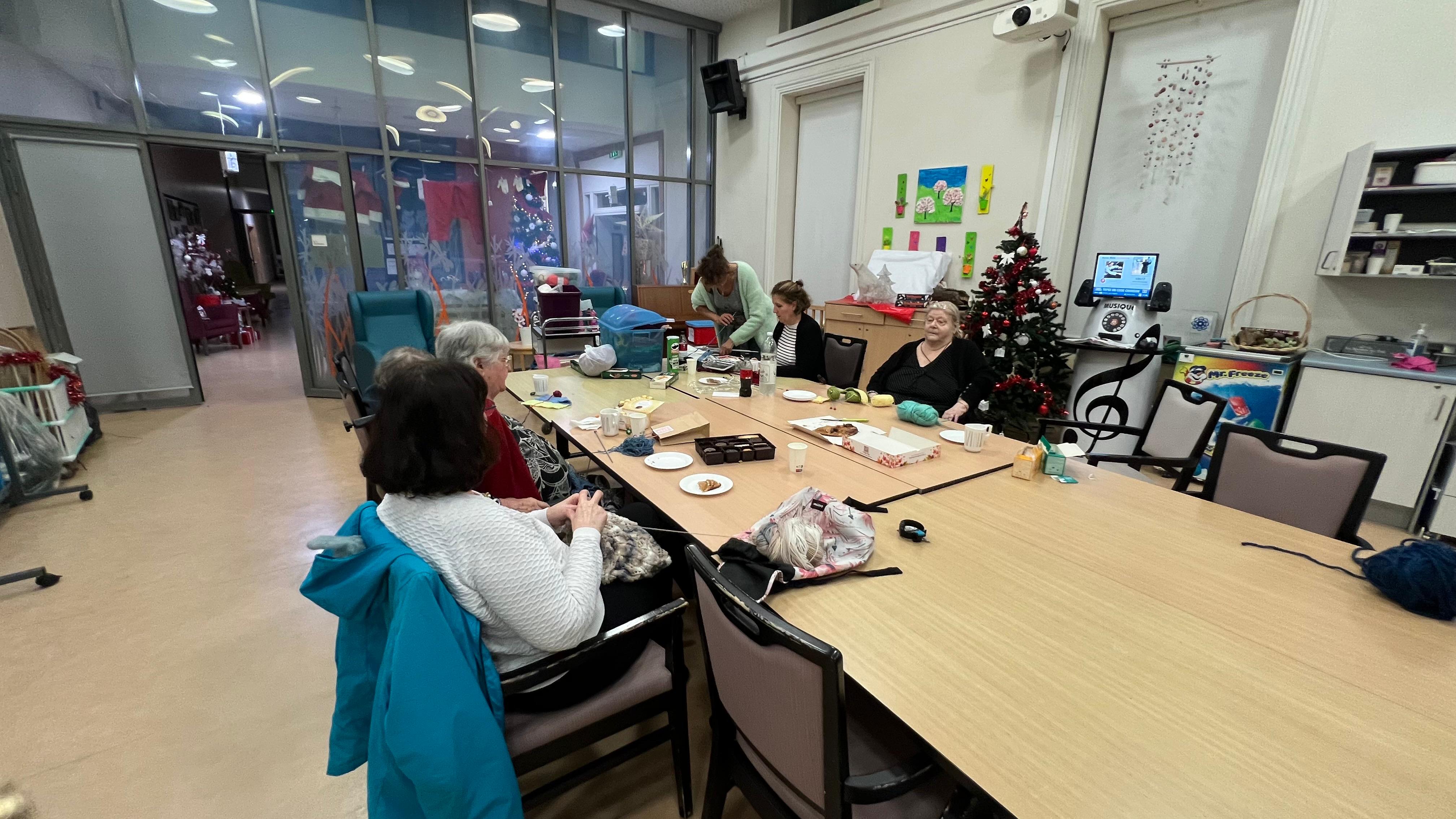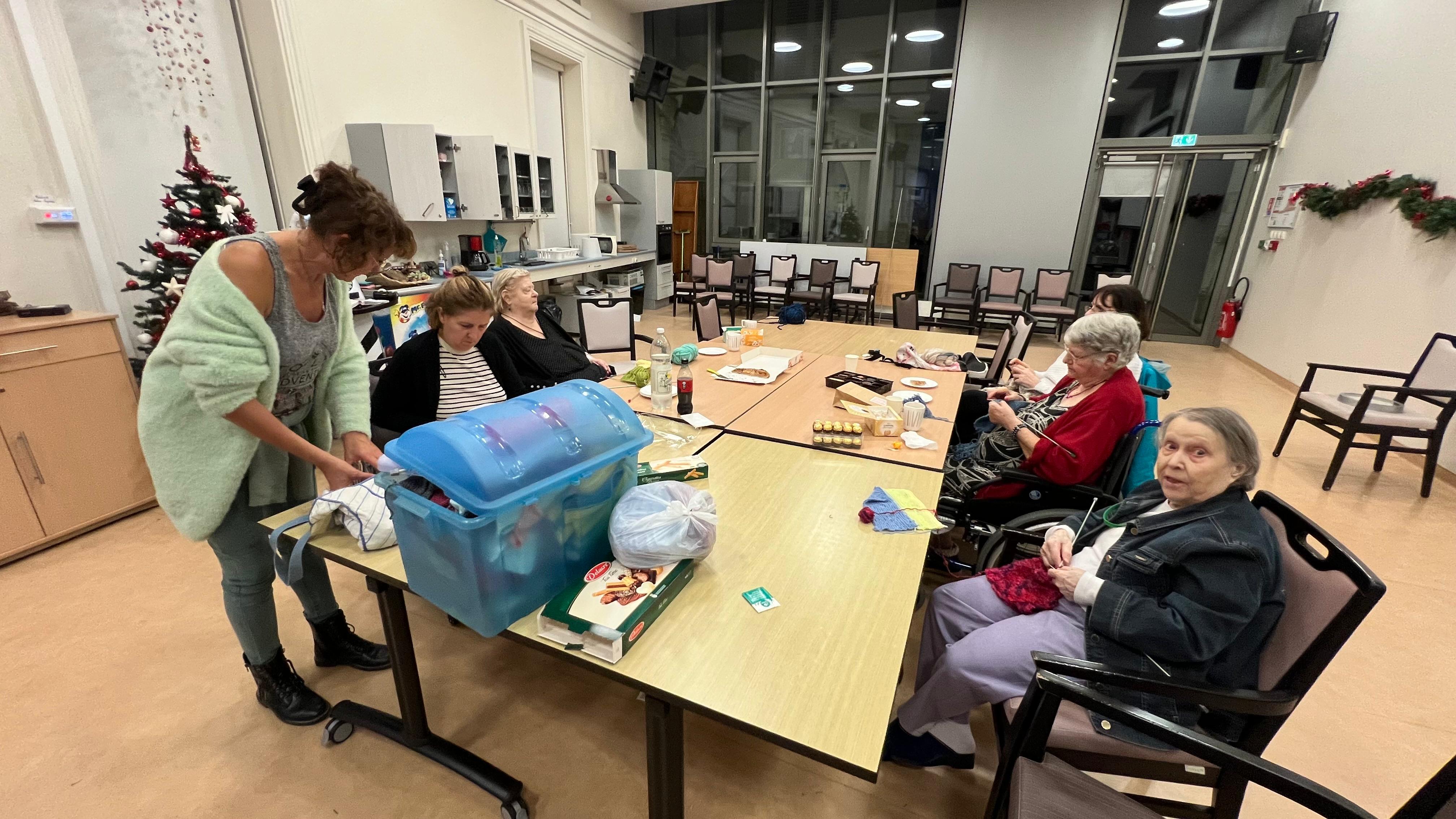 Nous avons également organisé notre première soirée tricot. L’idée était que les résidents qui le souhaitaient puissent apprendre au personnel a tricoter. Nous avons passé un moment agréable autour d’un thé, de biscuits et de confiseries. Ce fut un très bon moment de complicité entre les résidents présents et le personnel.